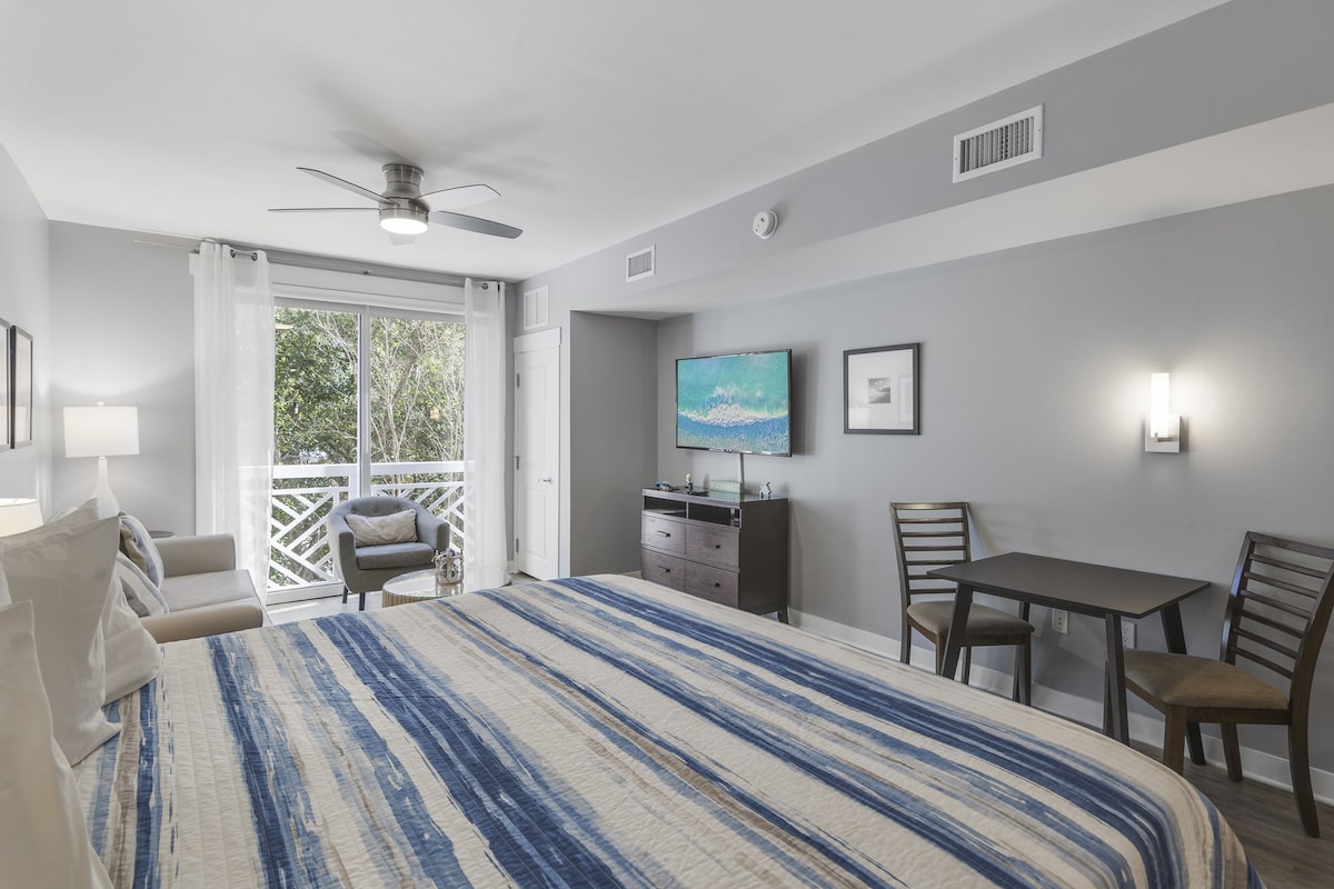 Stylish studio in Sandestin Golf & Beach Resort, just steps from the Village of Baytowne Wharf. Enjoy resort tram access, vibrant dining and nightlife, and a well-maintained, beautifully decorated space. Ideal for a relaxing escape with a king bed, queen sofa, and a kitchenette with sink, microwave, and mid-size fridge. Stay connected with Wi-Fi, stream Netflix, and use beach chairs and umbrella from our private garage-level storage.