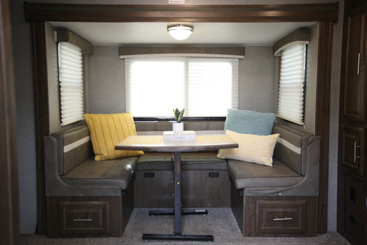 The "Wheelhouse" glamping is a perfect getaway, for a retreat from the hustle of the busy tourist areas but still a short drive to the beach or bay. Get away from it all when you and enjoy yourself in the RV or the 40ft screened with a swing bed and porch bistro set. The unit has a queen size bed, bathroom with a stand up shower. Kitchen is fully stocked. This RV has a TV, cable and wifi. The living area has a full couch and heated recliners. We also provide bikes.
