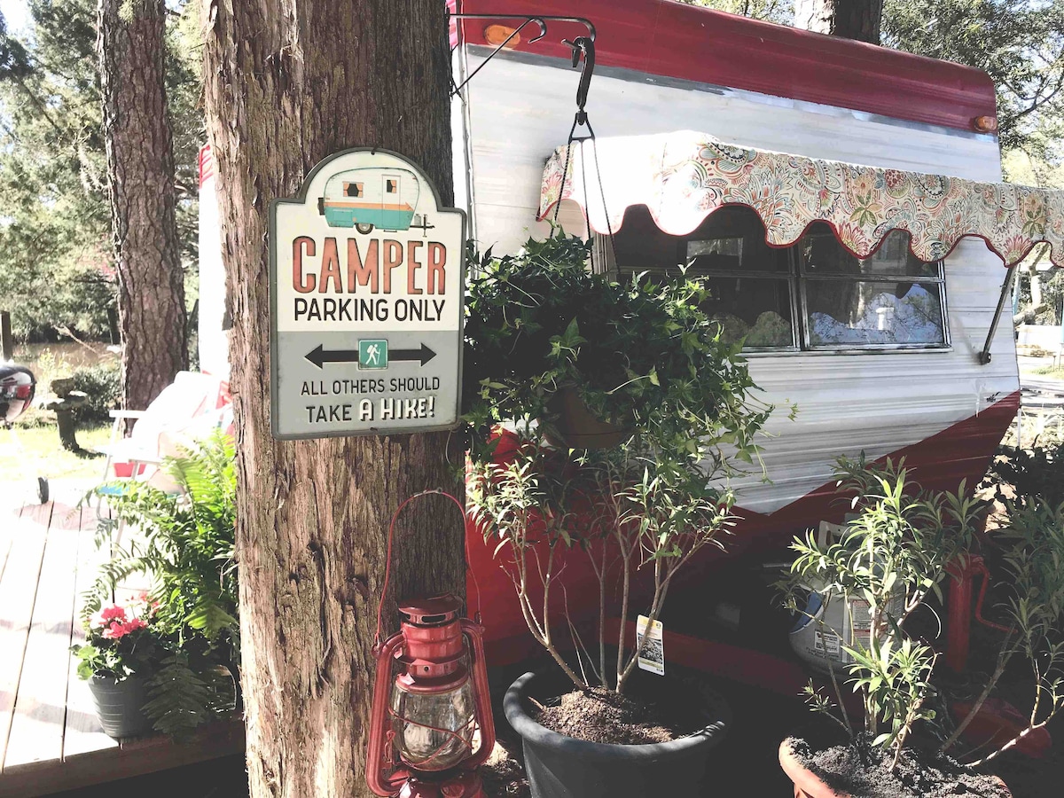 Our waterfront retro camper, Ida Claire, sits on the channel off of Jolly Bay. It's a perfect size for the solo traveler We have a complementary canoe & kayak for our guests use along with a firepit & charcoal grill. There is a small refrigerator for keeping your drinks chilled, a coffee maker, toaster, microwave & a tv. It offers a private outdoor shower & composting toilet Sitting on our 1.5 acre lot along with our other rentals is safe-relaxing Ten minutes from the beach,great restaurants.