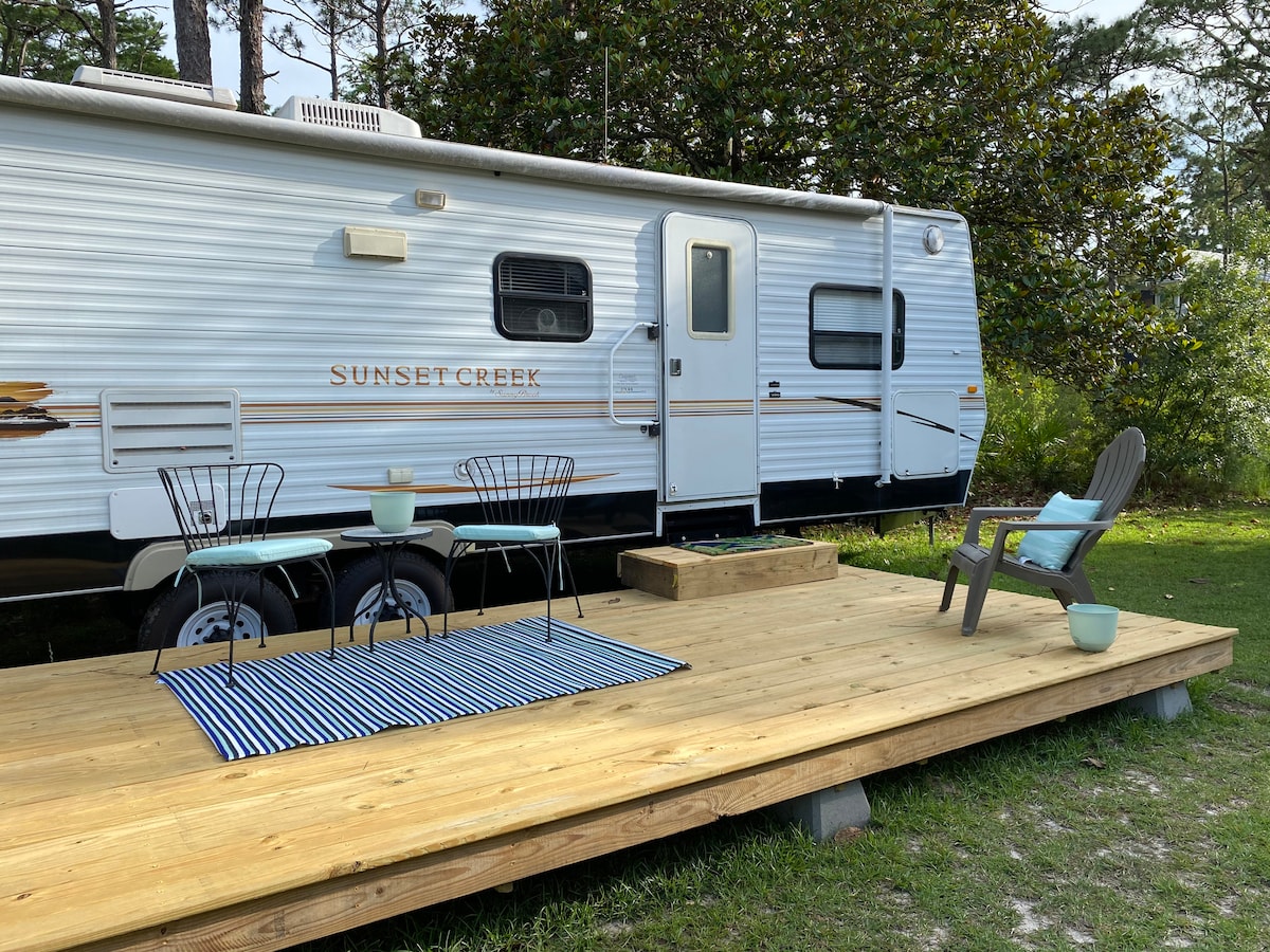My recently renovated 27ft travel trailer feels more like a coastal cottage. The updated decor gives off all of the beachy vibes! My camper is located on a quiet residential street where it faces an empty lot with great views. At one end of the street is the beach with our neighborhood access point, and the other end is a state forest with hiking and biking trails. The location in Seagrove is a quick bike ride to Seaside, Publix, shops/restaurants, and many other local attractions.