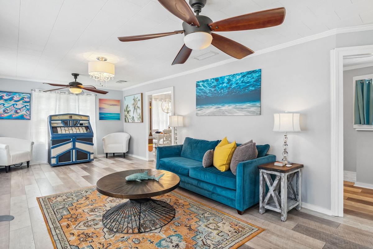 The Blue Marlin is a quaint little beach cottage less than a half mile walk to white sand beaches. The front yard has a tiki deck, a grilling area, a small bar area, cornhole and a picnic table all surrounded by beautiful tropical landscaping. Paddle board, two beach bikes, fishing gear, grills, fire pit, all included. Family friendly, offering onsite pack-n-play, high-chair, kids kitchenware and beach toys, from boogie boards to sand toys!