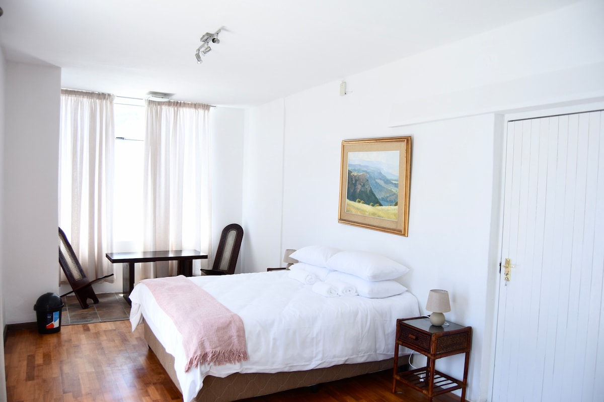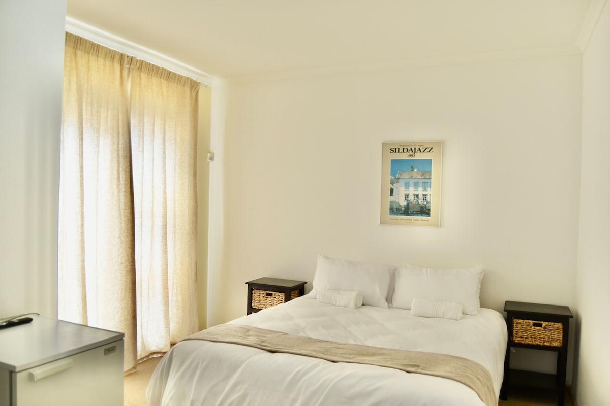 Our well-equipped, self-contained apartment is perfect for a couple, or family of three/four. A 15-minute walk from the ocean and close to local shops and restaurants, it offers the perfect resting spot! There is a fully-equipped kitchen and an indoor barbecue/braai facility, as well as a sunny outside area. A garage is available for a small car, and there is ample free street parking. The bedroom is newly equipped with air conditioning, and a window that catches the refreshing ocean breeze.