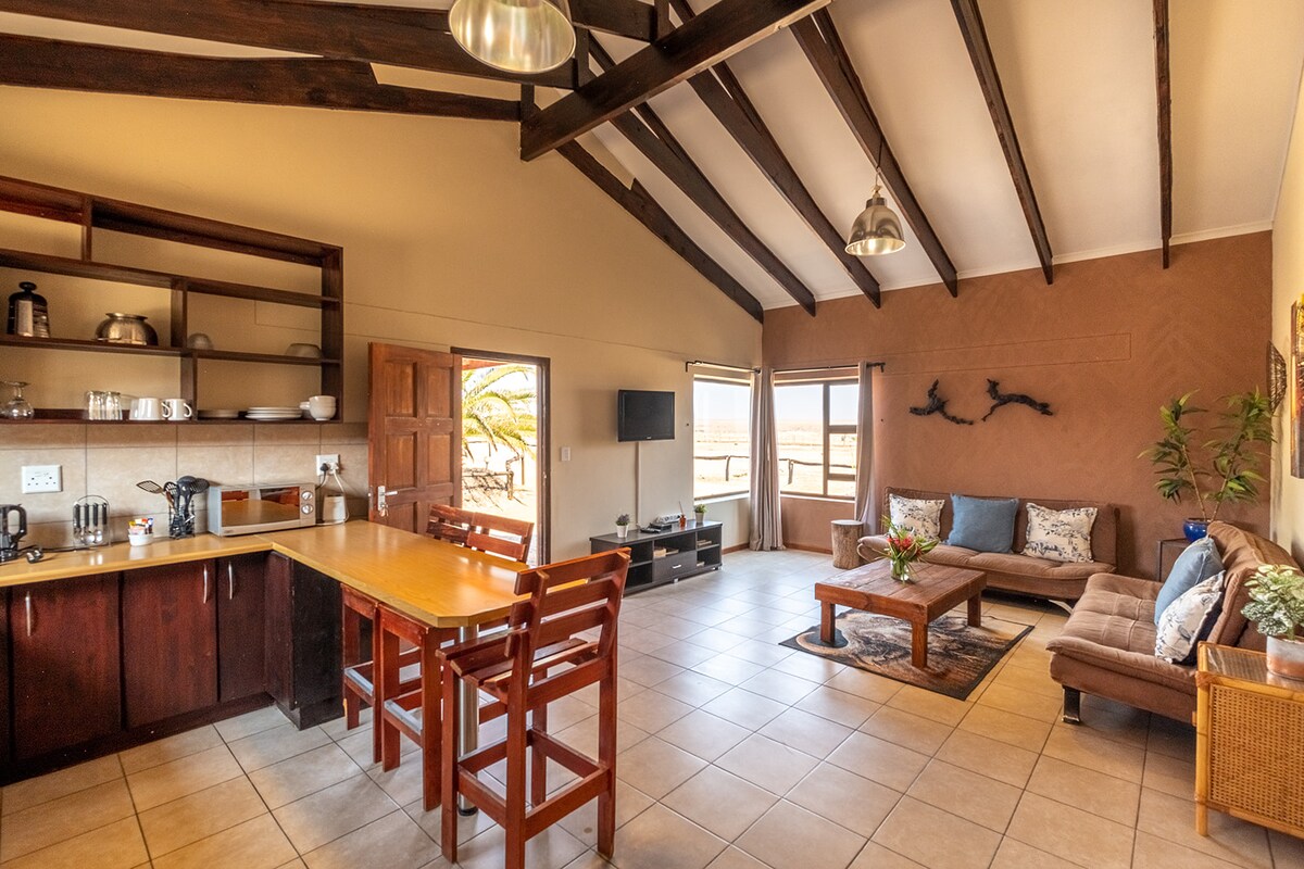 A sundowner with the magical un-interrupted view of the Namibian Desert, a peaceful start to your Namibian journey. 5 minutes walk to the town center and all it's amenities. Bookings of 4 guests or less have access to the bottom floor, whilst 5 to 8 guests get access to upstairs as well. Small bookings can use upstairs for the price of 5 guests.