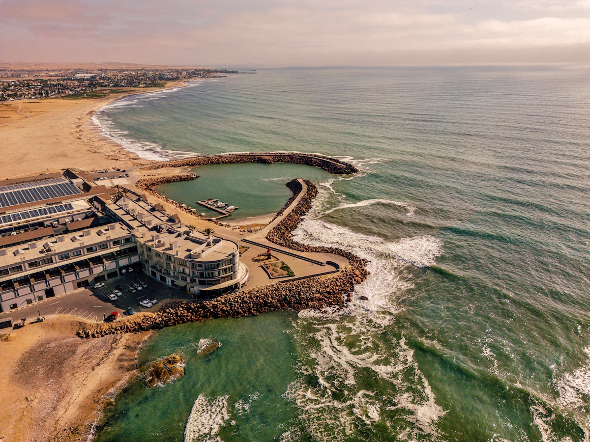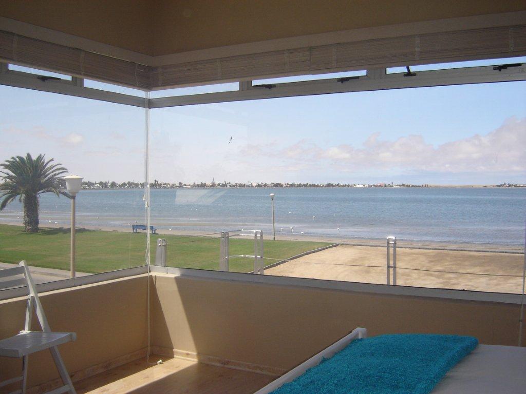 Beautiful detached studio apartment with ocean view. Right on the beach, it is one of only 17 beach front properties in central Swakopmund. 1 minute walk for brand new 4-star hotel with 4 great restaurants and a 5 minute walk to down town.