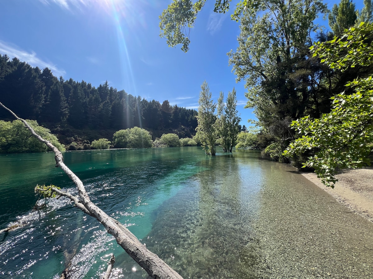 This picturesque lodge offers the best accommodation and location in Lake Wānaka. Amazing outdoor amenities . Imagine soaking in a hot tub overlooking the picturesque views of the Hawea river as you unwind and relax after a long day of fishing and adventure. An outdoor boathouse provides the perfect spot to enjoy a delectable meal as you relish the peaceful sounds of the river, native birds and bask in the serene tranquility of the surroundings. Newly renovated house, warm, family friendly .