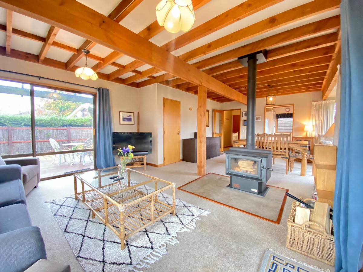 Close to town and lake is 5min walk. Enjoy easy access to everything from this perfectly located home base. All day sun and amazing views from this beautiful character house. 2 bedroom can accommodate up to 6people when adults with young children, although 4 adults is max. Large lawn space and plenty of parking. Cosy indoor open fire. Kitchen , bedrooms and bathroom recently renovated