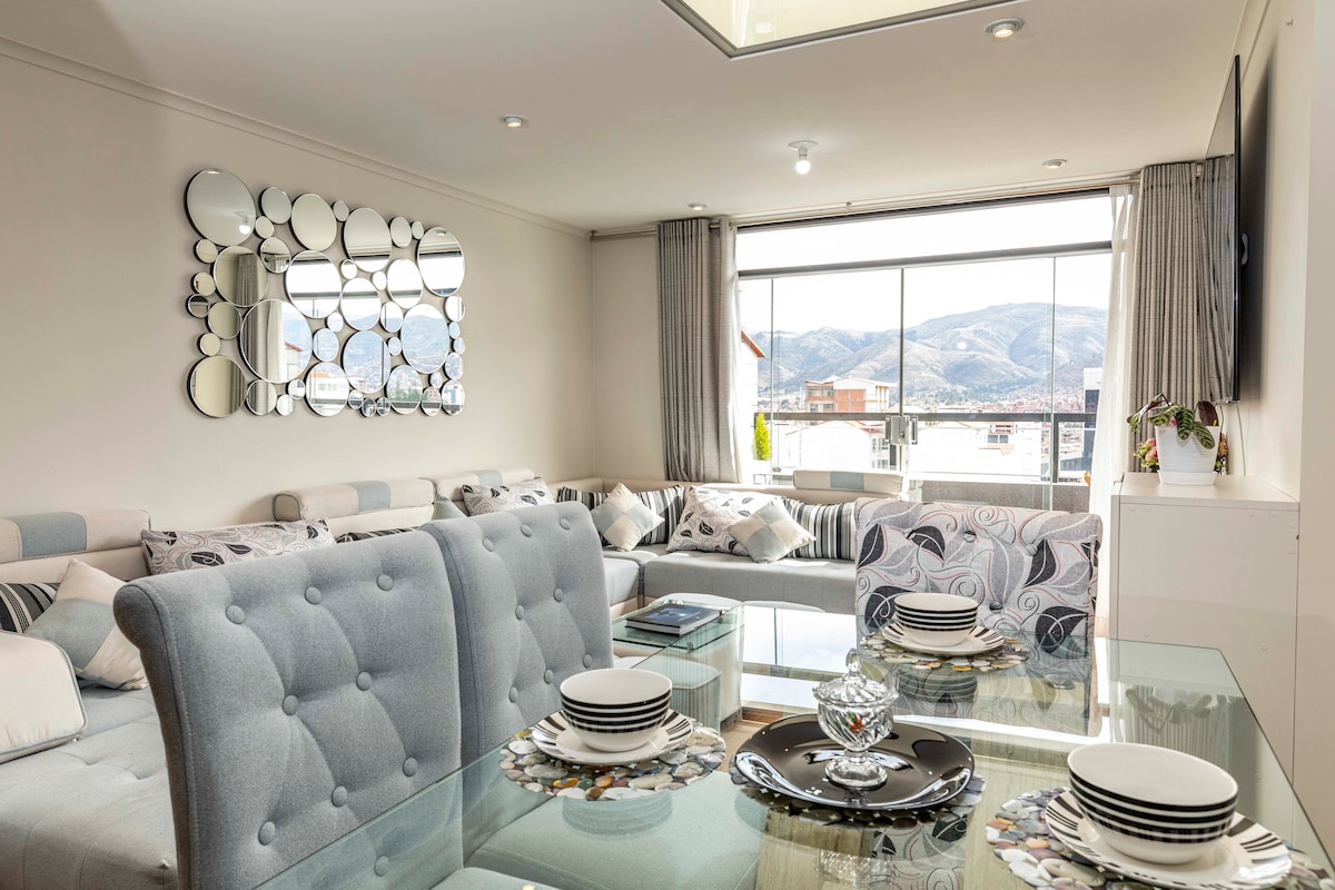 El apartamento se ubica en una zona céntrica de Cusco, donde podrás encontrar muy cerca supermercados, restaurantes, farmacias, entidades bancarias y financieras, casas de cambio, clínicas de salud y otros, decoración moderna sencilla, funcional, acogedor y bien iluminado. Sala con biblioteca, Wifi, Netflix, Cable mágico, sofás confortables, moderna cocina y comedor totalmente equipado, duchas con abundante agua caliente las 24 horas, terraza con sombrilla y vista panorámica de la ciudad.
