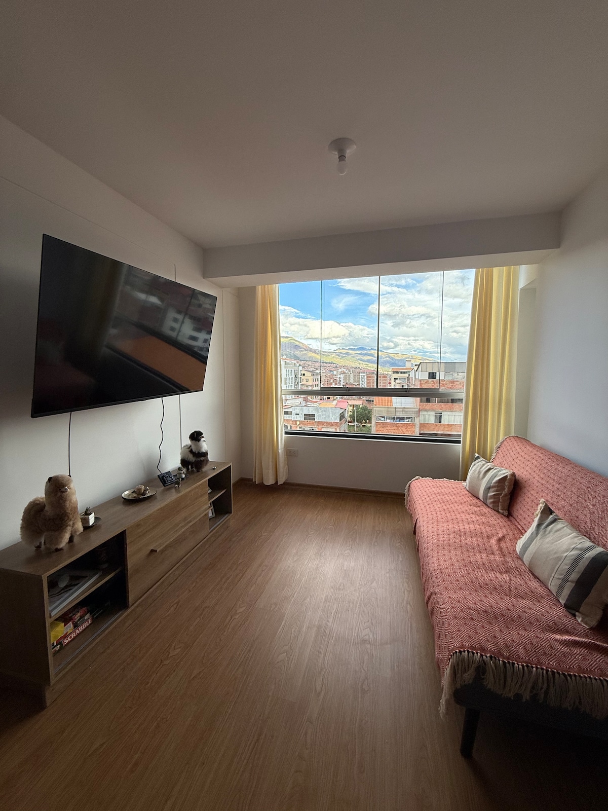 Alquilo departamento de estreno muy acogedor de un área de 85 M2 construcción nueva y decoración confortable y alegre con excelente iluminación y vista a la ciudad de Cusco, ubicación céntrica a 5 min. de la plaza de Armas de Cusco en taxi, cerca a bancos, restaurantes, centros comerciales. Zona muy tranquila y segura para transitar. Le ofrecemos servicio de orientación turística. Estoy segura de que tendrá una estancia muy placentera. , etc.