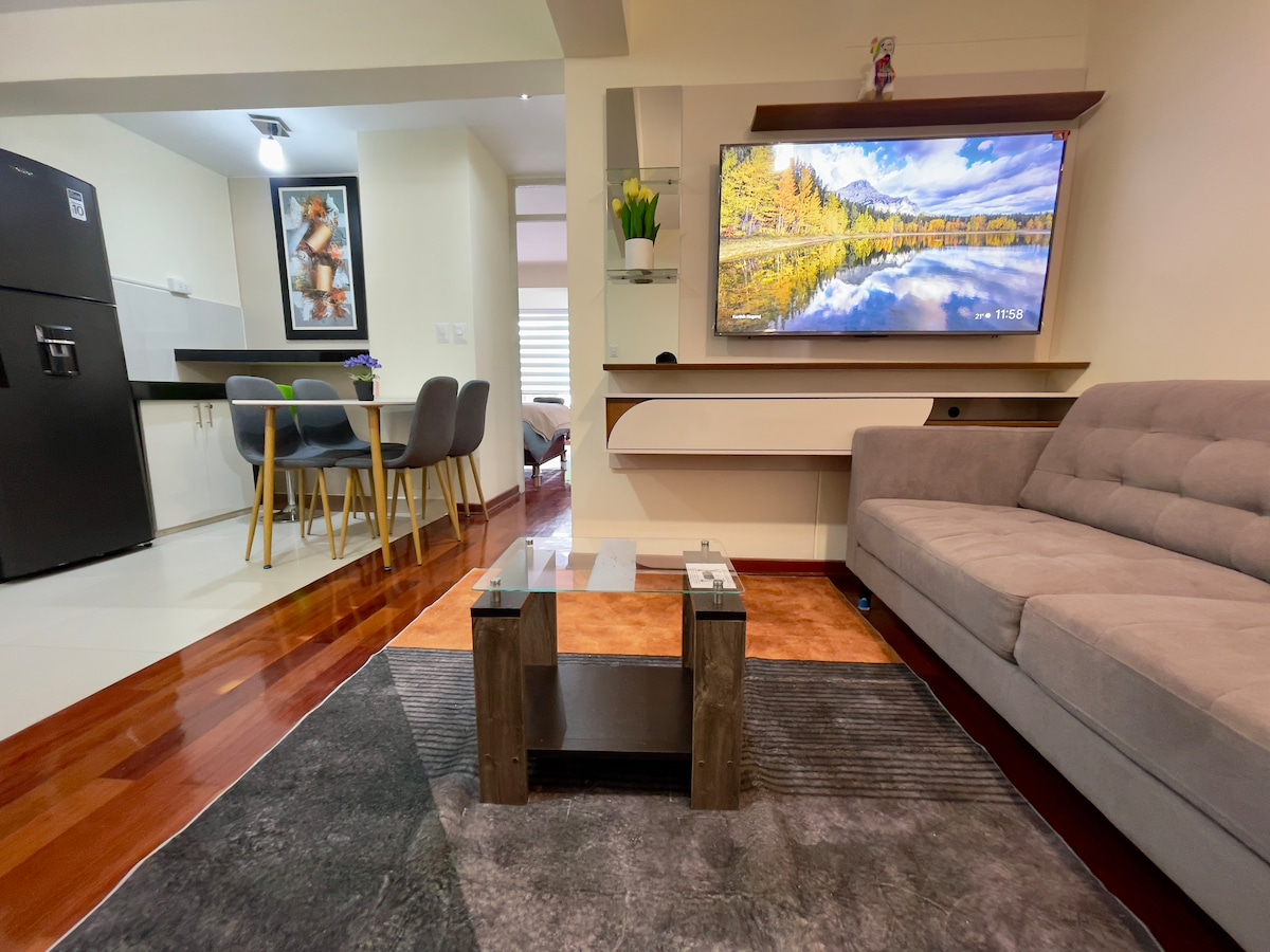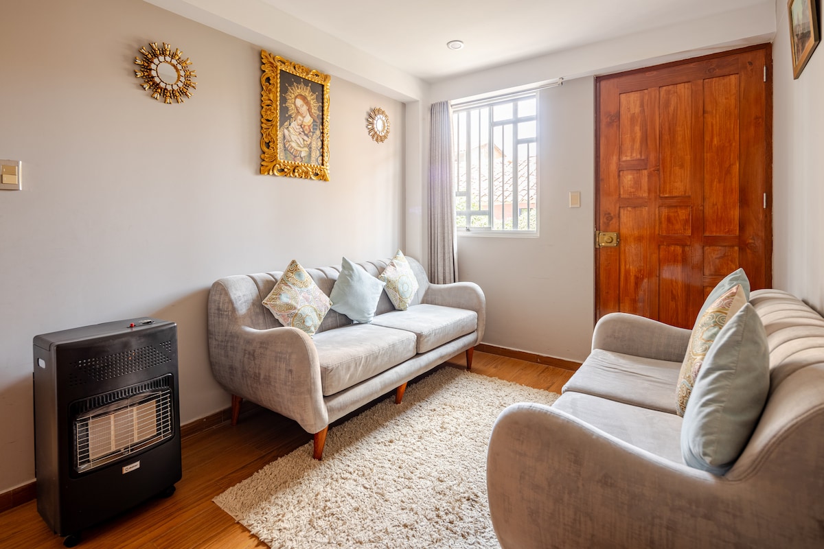 Cozy and spacious apartment in Cusco with panoramic views. Ideal for up to 6 guests, it features 3 bedrooms with TV and heaters (optional), 2 full bathrooms, living room, dining area, fully equipped kitchen, laundry, and WiFi. Hot water 24/7. Located on the 5th floor (no elevator). Parking available. Just minutes from the historic center — perfect to enjoy Cusco in comfort and peace.