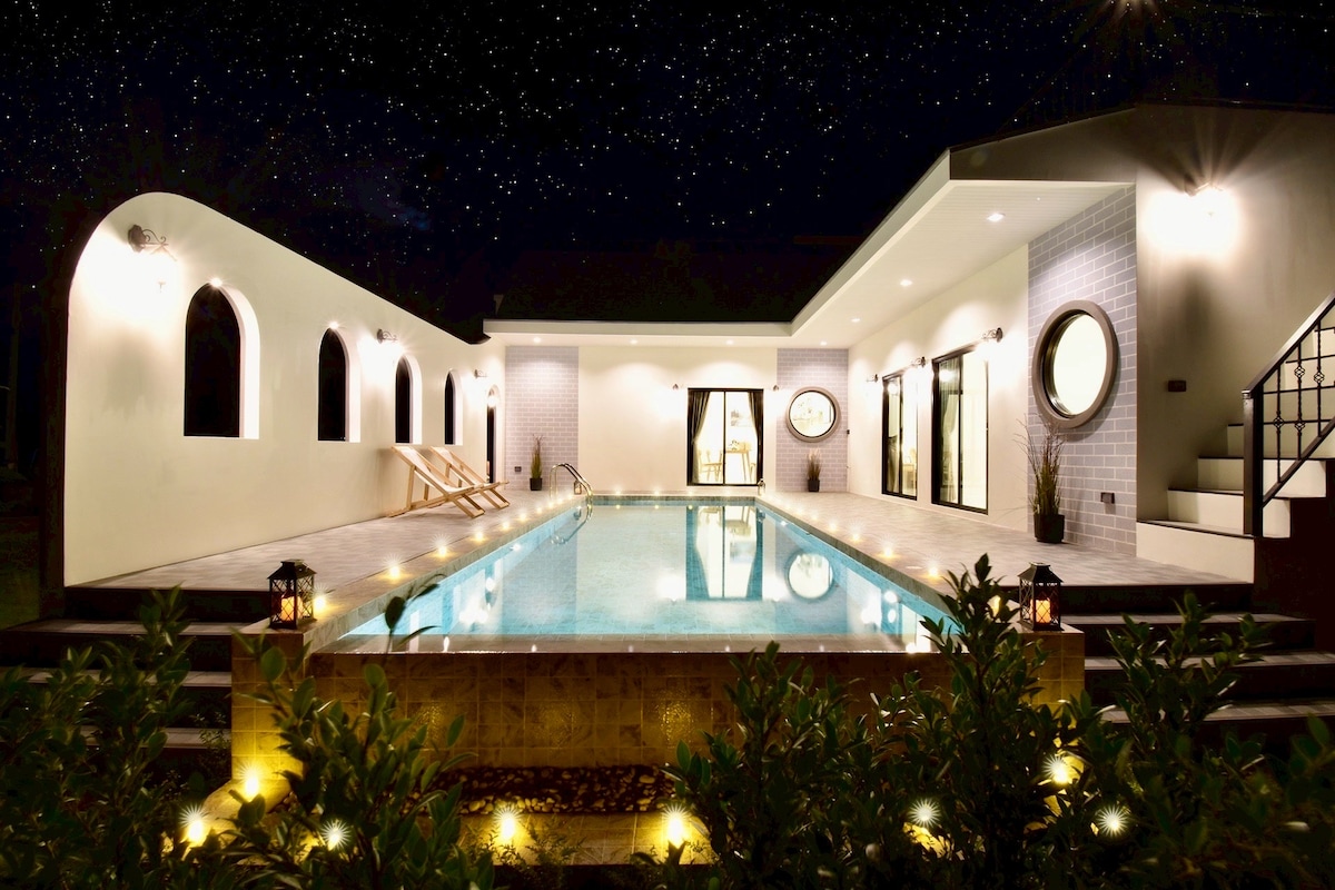 Escape to our cozy villa in Khao Yai, Thailand, where nature meets comfort. Enjoy stunning mountain views from the balcony and a peaceful cornfield vista from the living room. Your stay includes hotel-style amenities, a pool table, game console, board games, and karaoke with musical instruments. Start your day with a delicious breakfast and end it with a BBQ by the outdoor fire pit under the stars. Perfect for relaxation or fun, our villa is your ideal getaway destination.