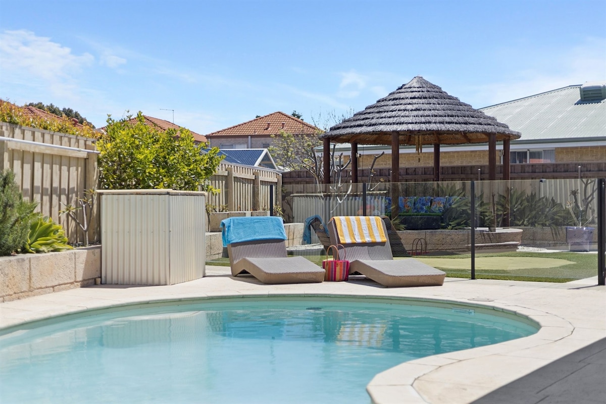 Stunning Beach House Retreat with a fully fenced private pool and a large enclosed garden great for the kids to run around in Escape to this serene beach house, the perfect getaway for families seeking relaxation and comfort. Located just a short walk or a 2-minute drive from Scarborough Beach, you’ll have cafes, restaurants, shops, and entertainment venues right at your doorstep, this beautiful retreat offers everything you need for a memorable stay.
