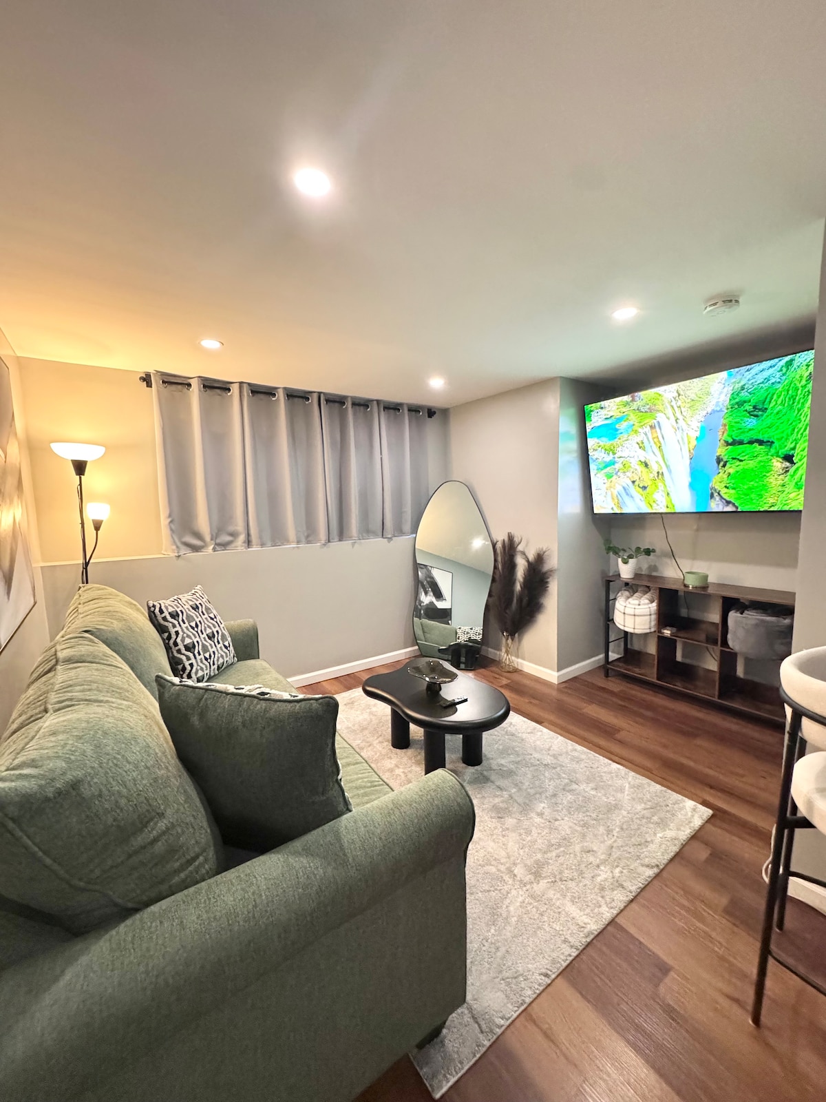 This stylish place to stay is perfect for anyone looking to get away! 3 rooms living room- Bedroom-small workout room. This spacious airbnb comes with fully stocked entertainment system, work out equipment, fire place, super fast wifi. This aribnb is located by prime locations such as 20 mins to jones & long beach, 15 minutes to nautica mile, roosevelt field mall, 10 minutes to Eisenhower Park, 5 mins to Nassau Coliseum, 20 min to USB arena + more. your bathroom is private.