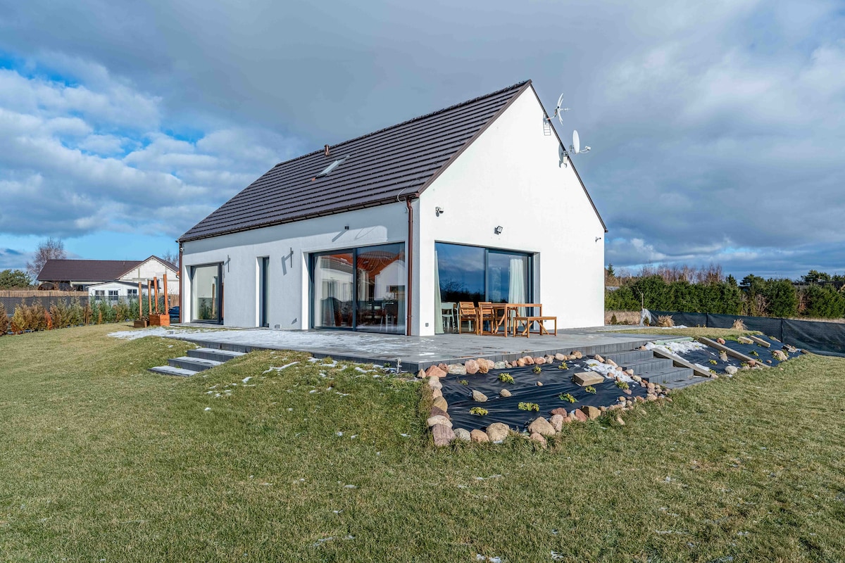 This is a beautiful, 175qm large luxury holiday house-built in 2016 on a 900 sqm large, fenced plot. It's located on WOLIN island (Western Polish Baltic coast),10km east from Miedzyzdroje. You can find here an absolute tranquility.The house is located 50m from Wolin National Park (a great forest) and 1,2km through this forest to the beach. The beach itself: wide, wide, long, white sandy beach. In the house: a fire place+ sauna and 5 bed rooms (4 x double bed + 1 room with 2 bunk beds for kids)