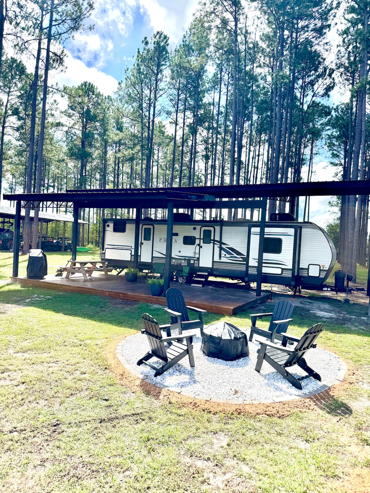 Peaceful place offering privacy and serenity. Located 6 miles from the center of Waycross, GA. Private driveway. Plenty of room to park your trailer/equipment. Note that a truck or SUV is recommended. The property is 1/2 mile down a dirt road that can get messy when it rains a lot. 2018 36ft RV with stove and refrigerator & shower, FireStick TV *for use with your hotspot* Rare king size bed. Outdoor grill/refrigerator. Washer/dryer next door in garage.
