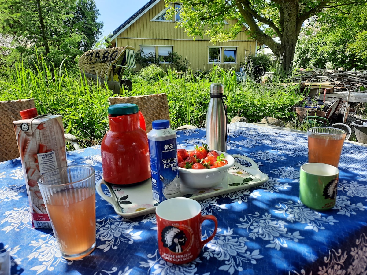 Sit back and relax in this quiet and cozy house. Perfect for a rural escape. With good bus connections to Kiel, there are shopping opportunities in town. There's a playground and a lake. The location is perfect for cyclists and nature lovers. You can relax in the garden, barbecue, sit by the fire pit, and sip your morning coffee by the small garden pond. Kiel can be reached in 15 minutes by car or bus. We look forward to welcoming you.