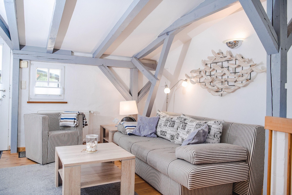Kleine, gemütliche, praktisch, perfekt gelegene Ferienwohnung in Warnemünde! Lichtdurchflutet, im Dachgeschoss, freut sich auf Freunde der Ostsee - die ist nämlich nur 70 m weit entfernt- aber trotzdem nur 4 Minuten zum Kirchenplatz, dem Herzen von Warnemünde. Da die Couch auch als Schlafplatz zur Verfügung steht, können bis zu 4 Personen dort übernachten- optimal aber für 2 Personen. Für Kinder stelle ich gerne Bett und Stuhl zur Verfügung auf Nachfrage. Hunde sind bei mir immer willkommen!