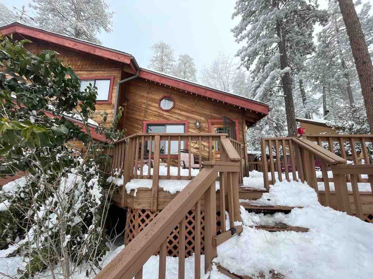 Cedar Crest is a nicely remodeled cabin while keeping its original charm. It is easy access. A few steps lead you to the deck in the middle of the trees... This cabin can sleep 2 people in a king bed and if you would like to bring your kids, the master bedroom has a full size futon. (Kids sleep free) For pet owner, the east side of the cabin has a fenced-in space. We recommend you do not let them be there unsupervised as a motivated mountain lion could jump the fence and arm your pet.