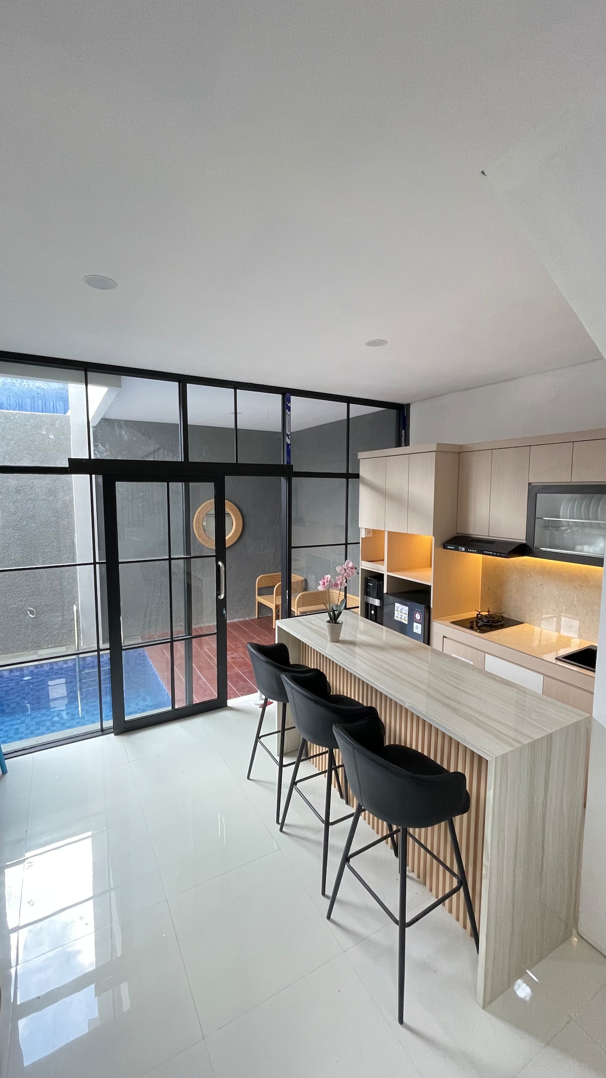 A villa with a private pool, and mezzanine design, featuring a sleeping area upstairs and a spacious living room with mini pantry downstairs. Accomodates up to 4 guest, with an extra bed option available. A connecting door is available to the next door villa of the same type. Located in a quiet yet strategic area, close to Yogyakarta’s popular attractions and culinary spots.