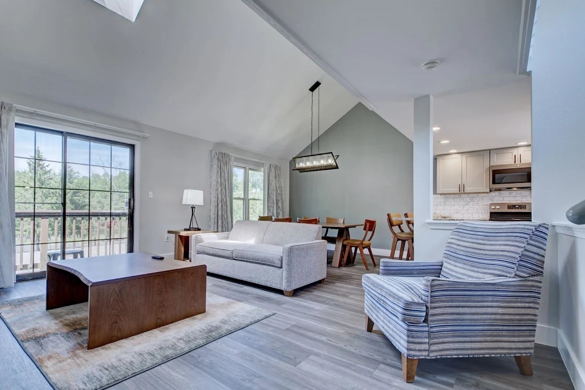 Beautifully renovated luxe townhouse for up to 8 guests, with 2 bedrooms, 2.5 baths, a full kitchen, office, loft, and a deck with a grill overlooking parklike shared grounds. Bright interiors, skylights, mountain views, and a marble master shower will take your breath away. Steps from Shawnee Mountain and a short drive to Shawnee Inn & Golf, Bushkill Falls, the Delaware Water Gap, outlets, and dining. Includes breakfast, snacks, and quality body care—ideal for families, couples, or groups.