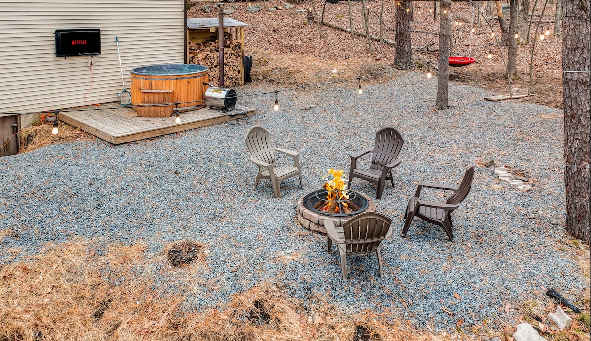 True nature escape with a wood burning hot tub, outdoor TV, fireplace & all the essentials you need for your Getaway escape! Hi-speed WiFi making it the perfect space to work from home. Great Location, only 10min drive from Shawnee Mountain & Bushkill Falls. The Cabin is suited for 8 people with 3 bedrooms. Open floor plan that connects the Kitchen, dining room and living space highlighted by a beautiful fireplace.Imagine yourself relaxing with your closest admiring nature's breathtaking views!