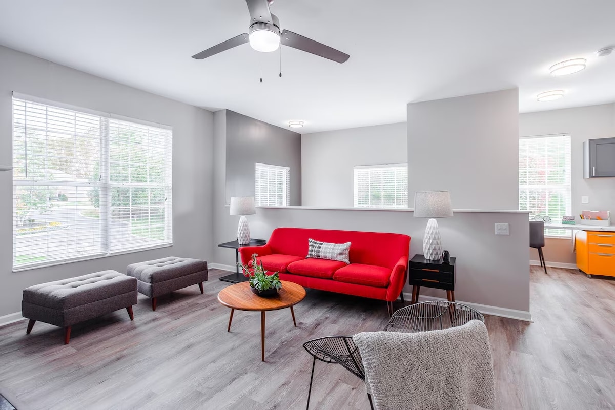 New for 2024/2025... updated furniture with memory foam sleeper sofa, memory foam king and queen beds, additional twin mattress for floor for extra sleeping options. Outdoor conversation area! Bright and airy carriage house, located behind main house on 3 acres in Lebanon, Ohio. Close to downtown Lebanon, Springboro, Waynesville and short drive to Kings Island. -Kings Island 11 miles -Warren County Sports Park 7 miles -Roberts Center Wilmington 20 miles -Caesar Creek State Park 10 miles