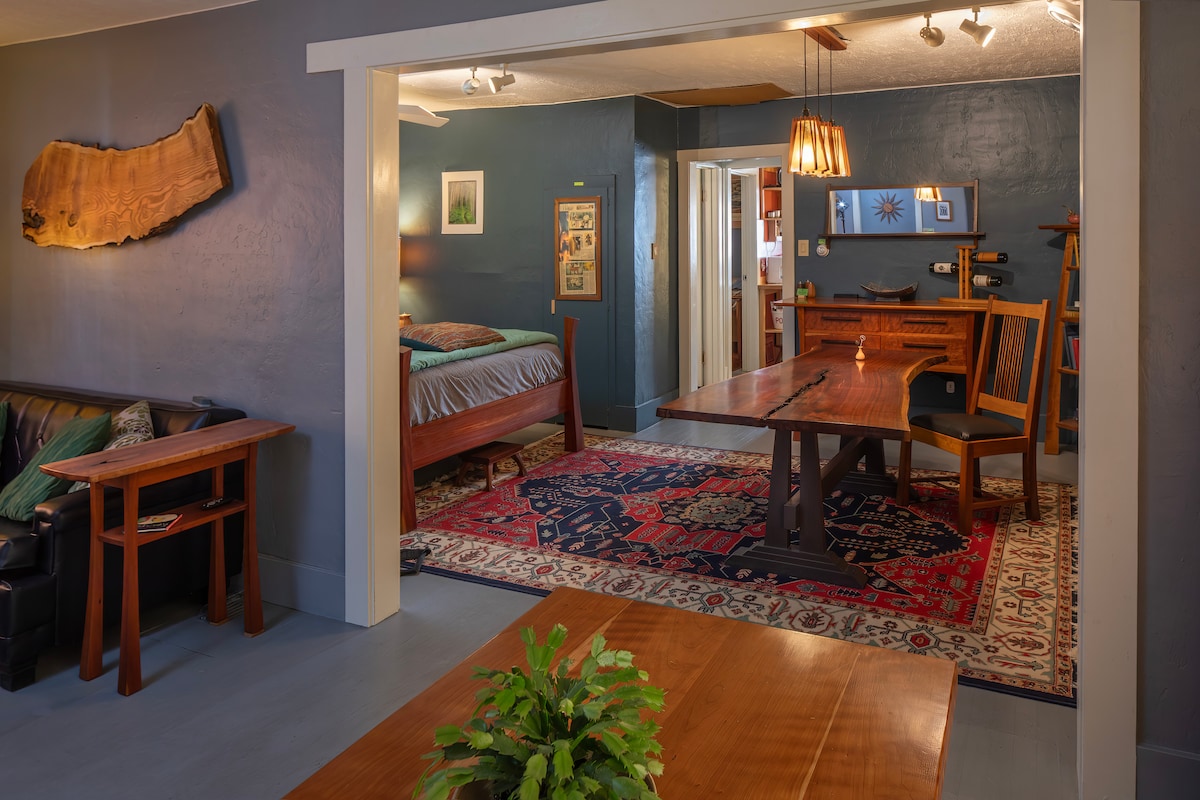 Stay in style in my showroom. All bed/bath/dining/living/kitchen furniture has been designed and built by me to showcase my woodwork and make the best use of this great space in downtown SB! Blocks to everything downtown, minutes to ND Neighbors include locally owned grocery, bakery, shopping… A sports bar, right across the street, coming soon! Purple Porch Co-op, Local everything! Macris Italian Deli/Bakery/Carmelas Roccos General Coffee Shop Inspire Me The Lauber Yellow Cat Cafe