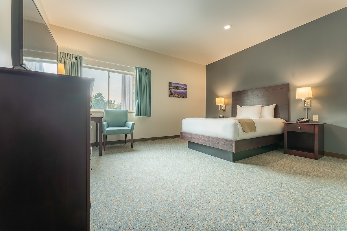 Located on the same level as the lobby, with just three steps up to enter, the Riverview Room offers both convenience and comfort. Two windows frame peaceful views of the river, filling the space with natural light. A queen bed provides a restful place to recharge, while a full kitchen with full-sized appliances makes it easy to prepare meals during your stay. With its riverside setting and cozy touches, this room is a relaxing home base for your Mad River Valley adventures.