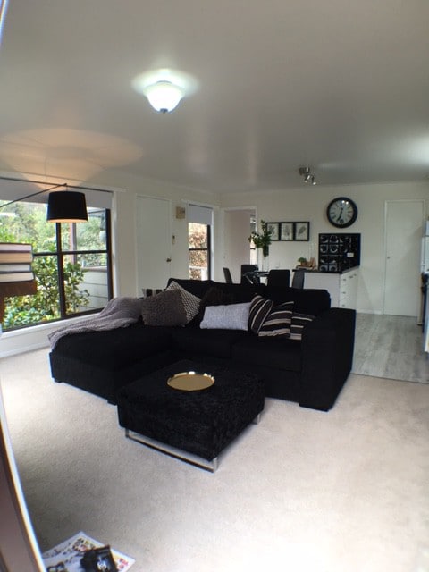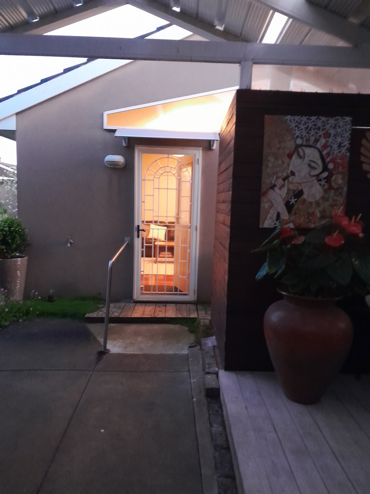 Hi! This our humble, cosy home. We welcome all genders and cultures to our loft. Peppa is a big white fluffy maremma & she barks at newcomers until she can sniff you but she’s very friendly. Enjoy your own private space, up high with the birds. Eat a free breakfast of smoothie & muesli, coffee & tea. You’re own separate space, behind my house that has its own entrance, a lush en-suite & lockable doors and block-out blinds.