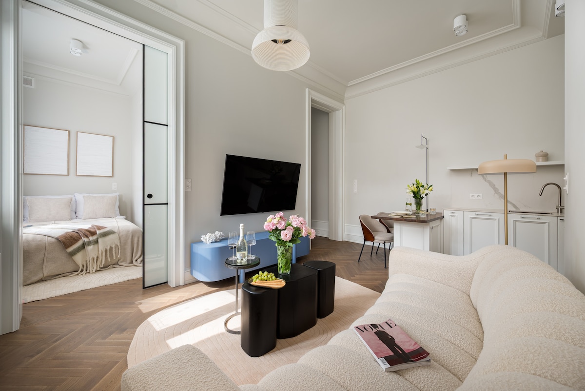 Centrally located, beautiful apartment in a renovated 19th-century building. Perfect for design lovers and those wanting to indulge in the creative energy of the Polish capital. It exudes charm and tranquility offering guests a serene retreat in the heart of Warsaw. Our philosophy is to propose you a home far away from home. We are more than excited and privileged that our quests admit and appreciate it.