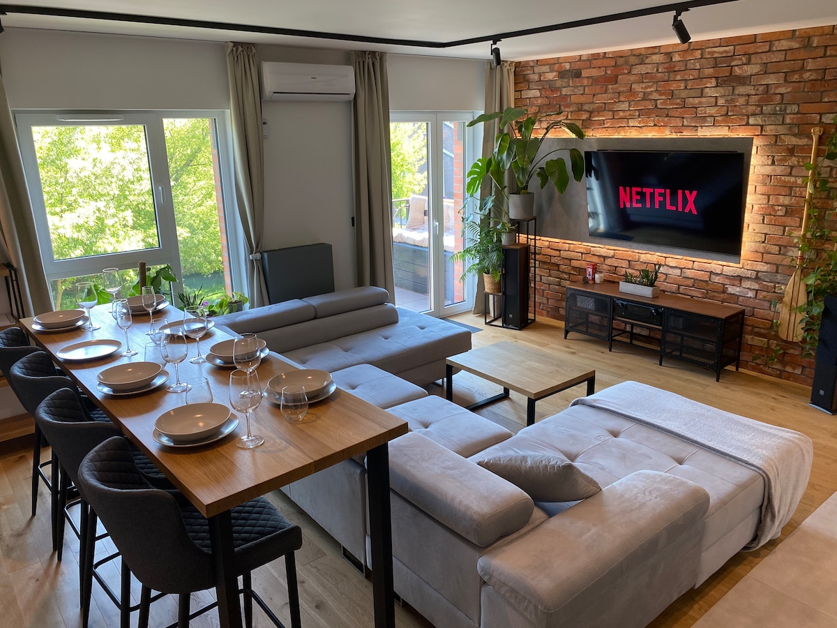 AmSuites - Discover a unique blend of luxury, comfort, and design in this stylish city apartment - perfect for a romantic escape, remote work, or a relaxing city break. ✨ Highlights: - 🧖♂️ Year-round heated Jacuzzi on a 55m² private rooftop terrace - 📺 55” Smart TV - ❄️ Air conditioning, high-speed Wi-Fi & full kitchen - 🚗 Secure garage parking included Soak under the stars, unwind in serene comfort, and make your Warsaw stay unforgettable.