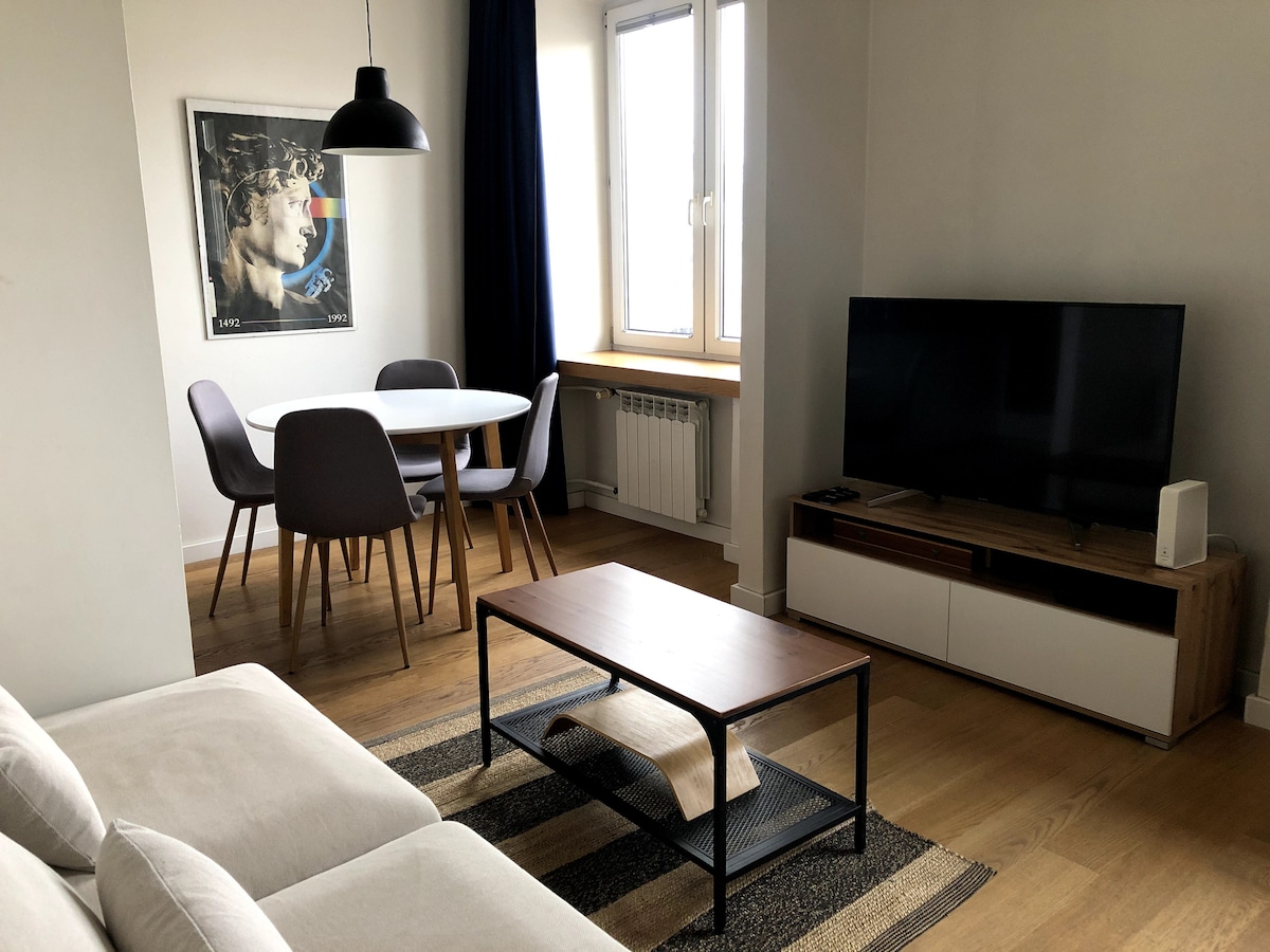 Petite lux apartment with a view of a buzzing city life. Centrally located on route to Chopin Int. Airport and Central Railway St.Excellent public transportation, walking distance to landmarks. Historical building (where the Warsaw Uprising begun in 1944).Plethora of shops, restaurants and coffee shops within walking distance (Green Cafe Nero -downstairs). Gated, elevator. App - freshly renovated; living room with a fully equipped kitchen, separate bedroom; bathroom with shower, laundry.