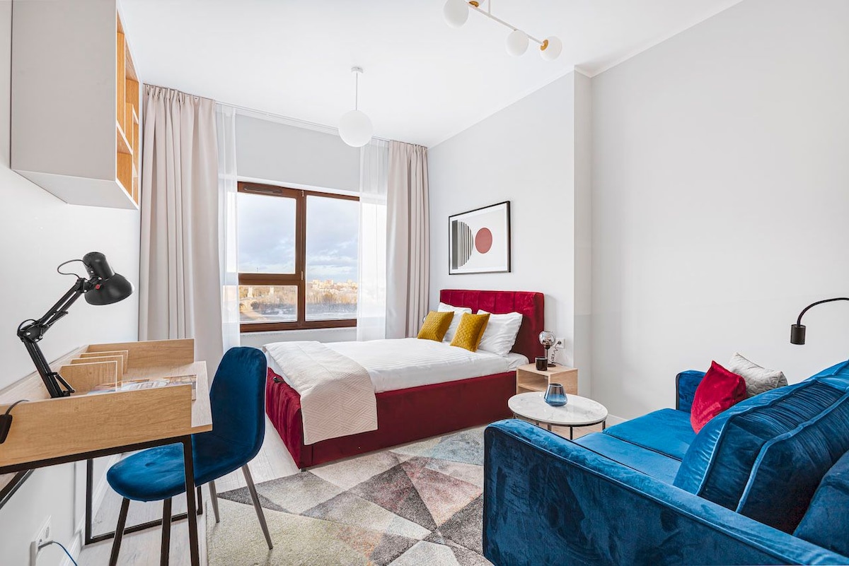 Modern 40 sqm Apartment located on 14th floor, with stunning view on the Vistula river and panoramic view of the city. Building is located in the downtown. This is unique location in close proximity to the Vistula Boulevards. Apartment consist of sleeping room with queen size bed, living room and kitchenette with amenities, bathroom with shower. WIFI is available and free of charge.