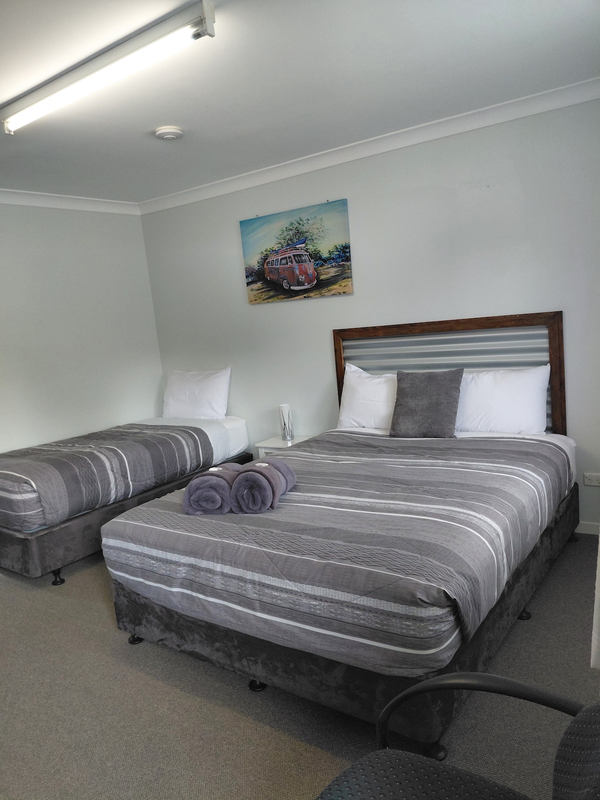 Our Two Bedroom Family Room is perfect for those who want their own space. It is self contained, ground floor, with its own veranda/patio, own entrance, outdoor settings, barbecue area, wood heater and a lovely bush vista. Bedroom 1 has a queen bed. Bedroom 2 has a set of bunks, lower bunk is a double bed and single bunk above and in the loungeroom, in addition there is a double bunk and single bed the whole family at this peaceful place to stay.