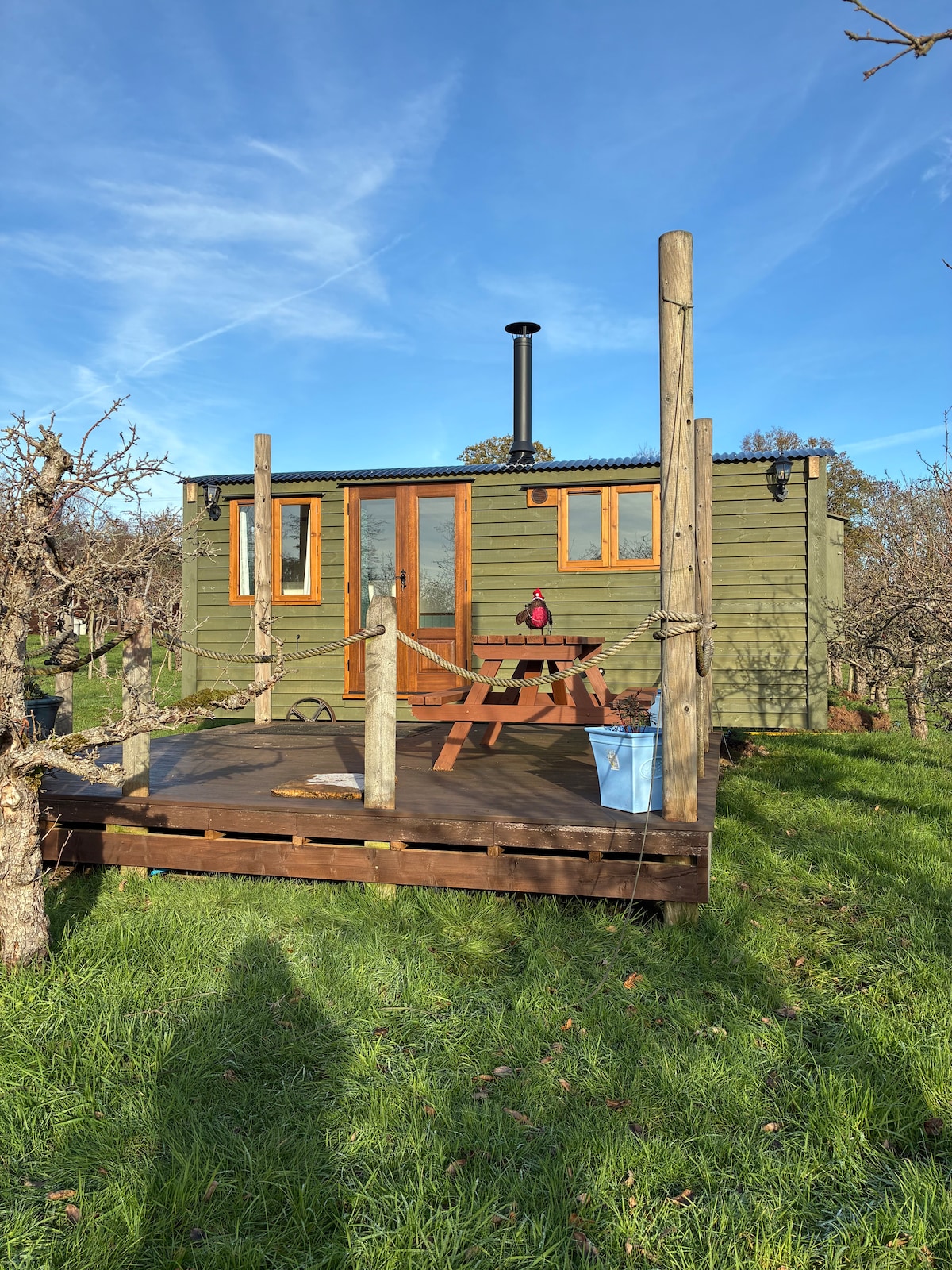 带木柴热水浴缸的舒适牧羊人小屋