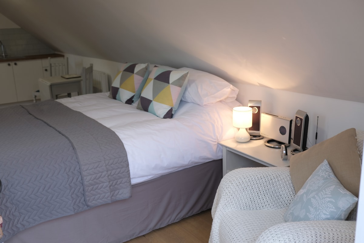 Modern light, clean studio loft for 2 from £60 per night. Suntrap private garden. Peaceful, beautiful setting. Hidden away yet near to Warwick, Leamington Spa, Stratford-upon-Avon. Fully equipped kitchen, SmartTV, superfast fibre wifi, large shower room, kingsize bed with 'Emma' mattress. Off road parking. No under 18s. LONG TERM LETS AVAILABLE AT DISCOUNT - PLEASE MESSAGE ME FOR DETAILS & AVAILABILITY.