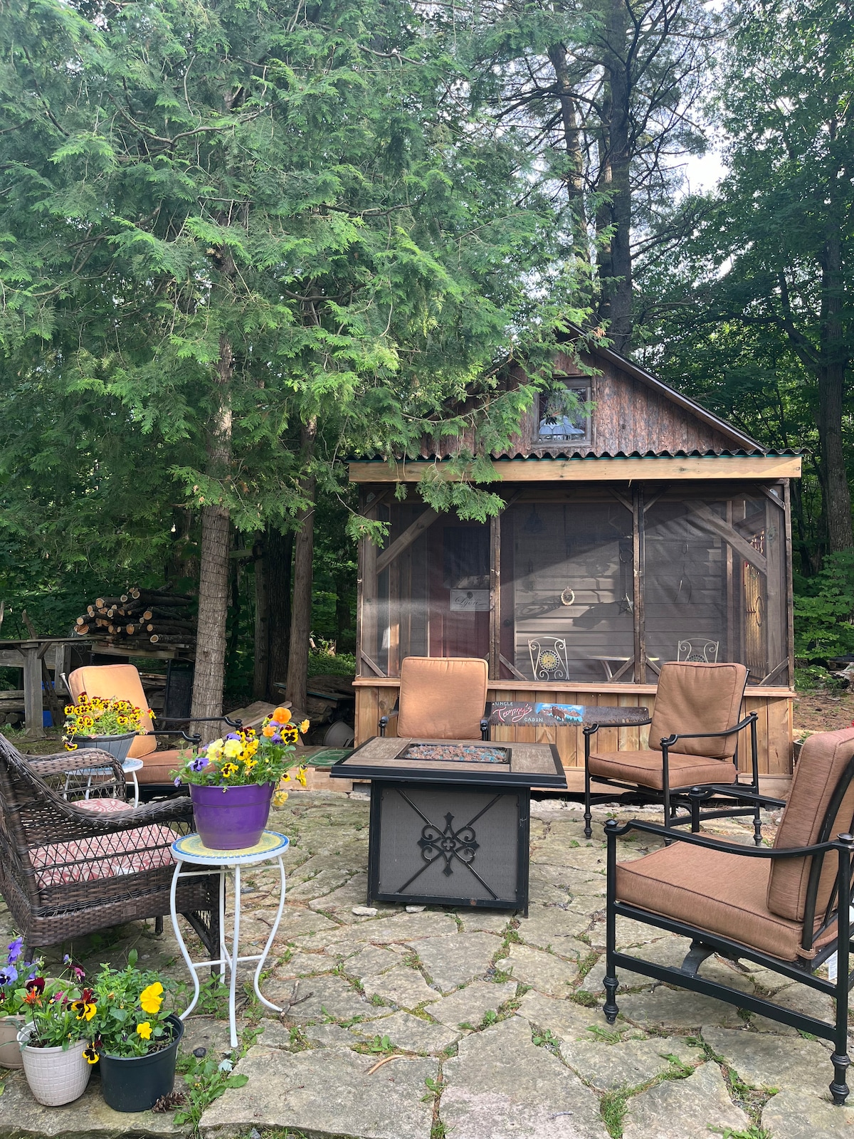 Welcome to our four season bunkie retreat on the river. Leave the world behind and seek comfort and peace at Riverside Ranch. Imagine starting your day reconnecting with nature amidst wooded walking trails. Along your walk you see geese swimming in the river, goats exploring the woods, and Highland cattle grazing in the pasture. Upon return, you open the door to the crackle & pop of a toasty wood burning sauna, followed by an icy cold plunge in the river. *No air-conditioning*