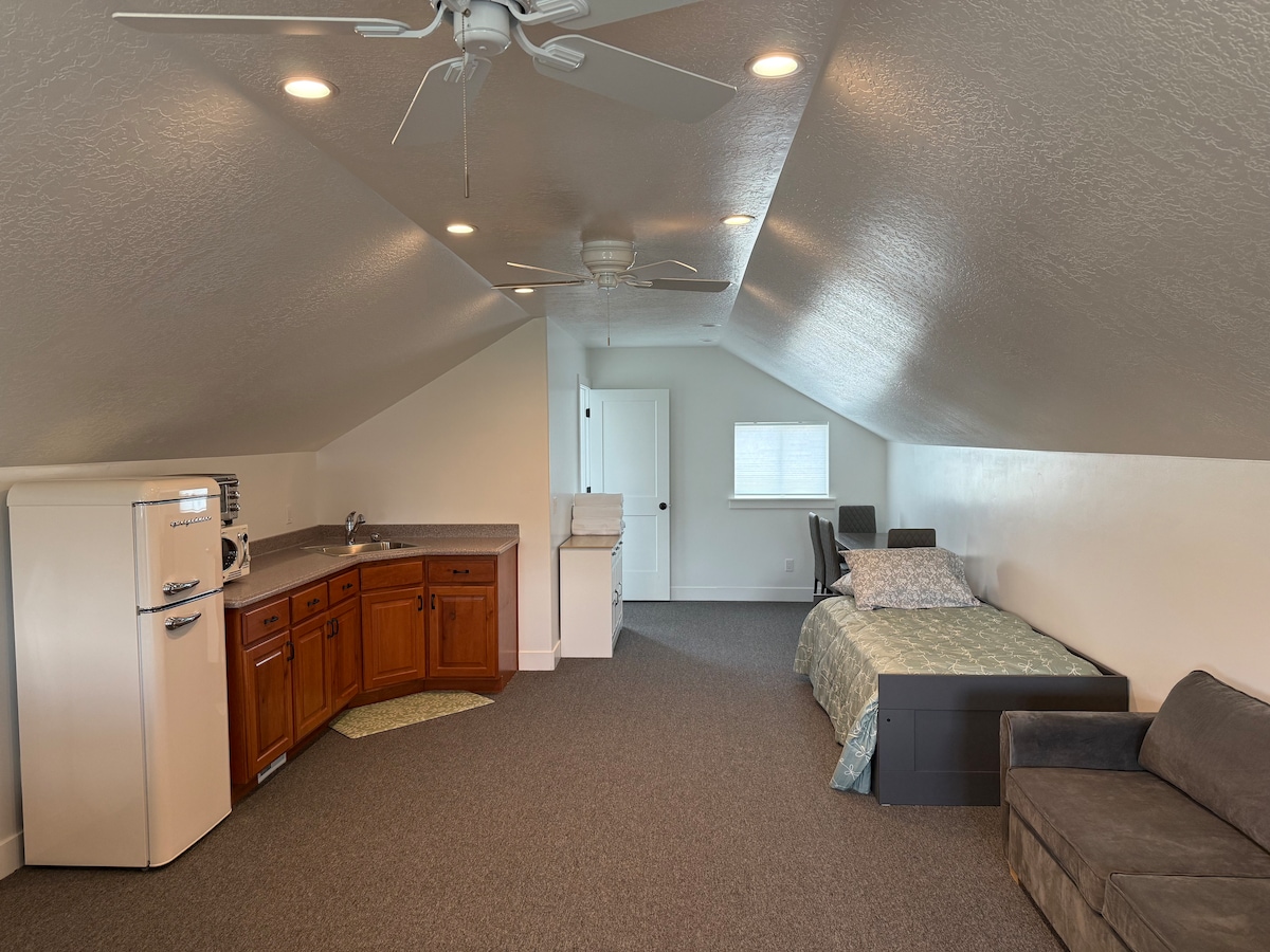 Keep it simple at this peaceful and centrally located guesthouse. This private space features a comfortable bedroom, an inviting living room with additional sleeping accommodations, a clean and functional bathroom, and a fully equipped kitchen for easy meals. Soft lighting and thoughtful details create a calm, welcoming atmosphere, ideal for relaxing after a day exploring the mountains or the Park City area.
