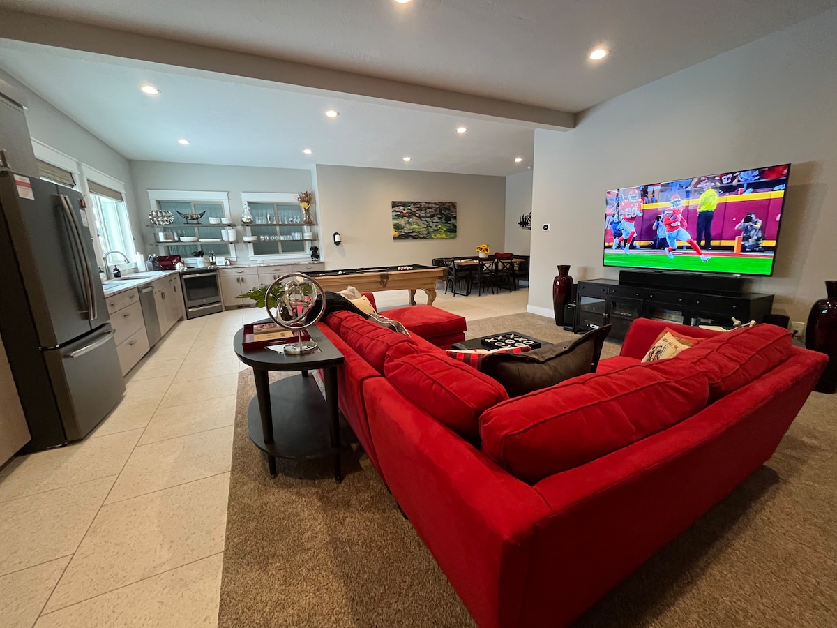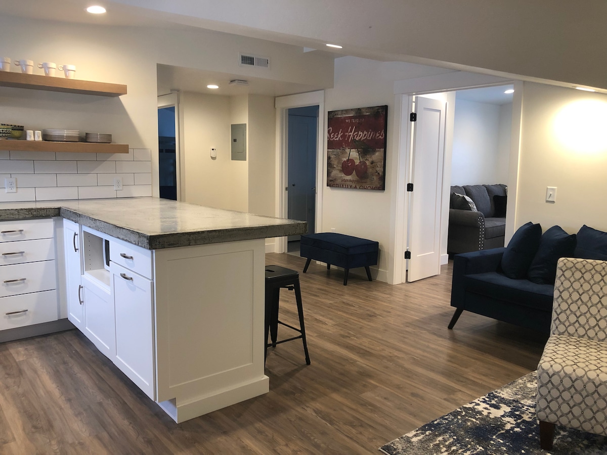 Comfy, fun, spacious guest suite for your group for both summer and winter activities! 10 foot ceilings, pool table and pinball machine, as well as many games and YouTube TV for entertainment after your ski or other outdoor activities! 4 beds (2 king, 2 queen) and 2 baths. Full kitchen with dining area for up to 8. Laundry room complete with products. Attached one car garage for guest use, with ski/snowboard racks and boot/glove dryer, and additional off-street parking space.