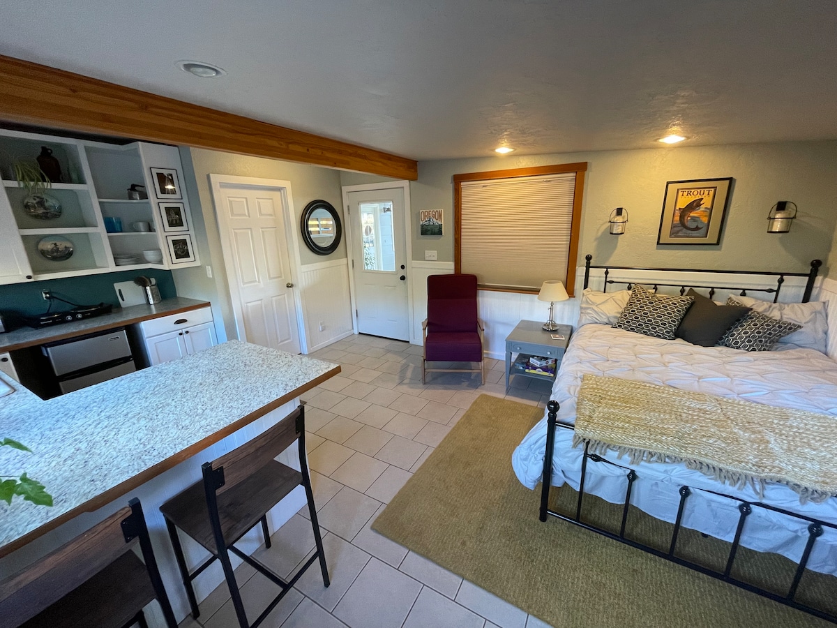 Keep it simple at our peaceful and centrally-located guest suite just minutes from White River State Park and the Deschutes River. Park your boat and trailer and enjoy a relaxing stay before or after your hunt or float. Get away for a few days and explore south Wasco County - hike, bike, and enjoy rural living. Our charming studio guest suite includes a comfy queen bed, Roku TV, kitchen, and full bathroom with a private entry and patio.
