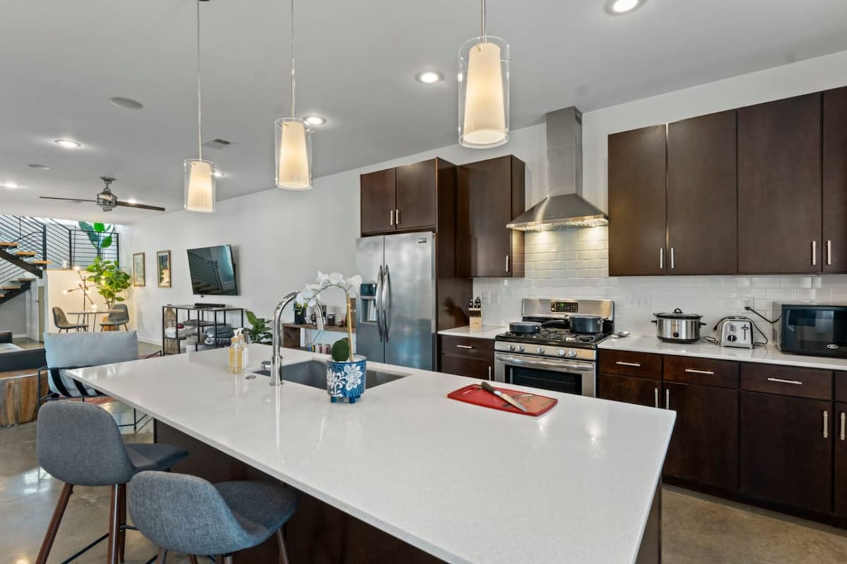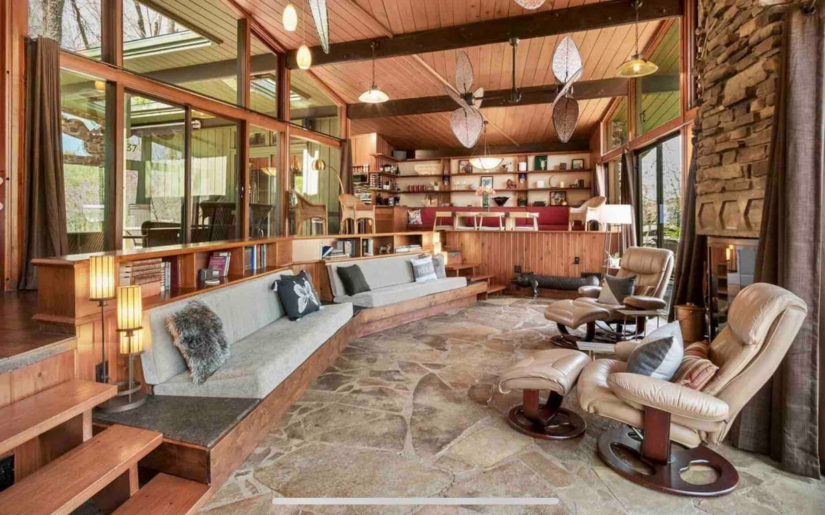Designed by local architect, Cyrus Sutherland, our home is truly one of a kind. With its intricate stonework on the outside, natural wood accents on the inside, custom built-in furniture and floor-to-ceiling windows throughout, Magruder is sure to leave a lasting impression. When you're here, you'll have access to all of our luxury amenities, including an open-concept living space, fully-stocked gourmet kitchen, Master suite , King size bed, and private outdoor patio with a hot tub.