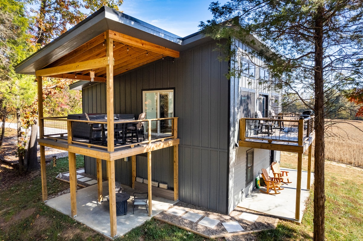 Reconnect with nature at this Tiny home for an unforgettable escape on our farm property. Sit out on the 350 sq ft covered porch with your coffee and watch the wildlife. Plenty of parking for your car, truck, Rv, semi or trailer. Enjoy the full tub/shower and washer/dryer with lots of storage. The kitchen has a fridge, electric stove, microwave and a dishwasher sink combo. Sit and watch tv with a pull up coffee table and a 55 inch tv. Enjoy the queen bed with a tv and a nice closet.
