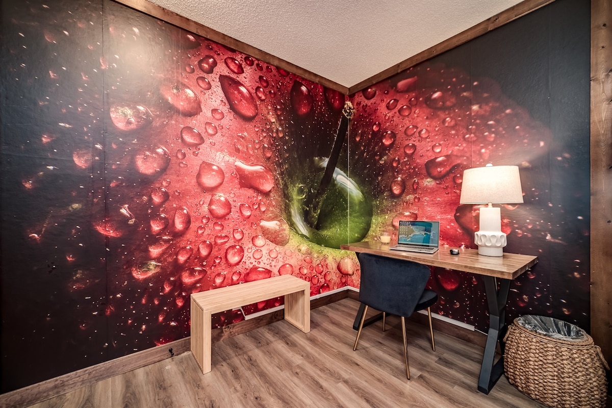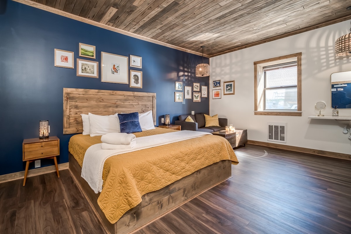 Modern Comfort with a Playful Touch The Kinni Suite brings warmth, style, and accessibility together in one inviting space. Featuring a plush king bed, cozy sitting area with a sofa, and a stunning tiled fireplace wall, this suite blends modern design with everyday comfort. Enjoy the convenience of a walk-in shower, mini fridge, microwave, and coffee bar—all just steps from downtown Prescott’s shops, dining, and riverfront views.