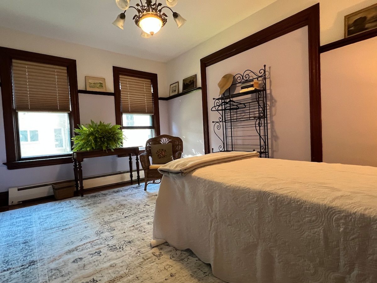 The VanBuren room has widows facing east and south. We have light darkening shades for those who want to sleep after sunrise. The room has a porcelain sink, a closet, a writing desk, and a king size bed with mattress warmer. A continental breakfast is included in the price.