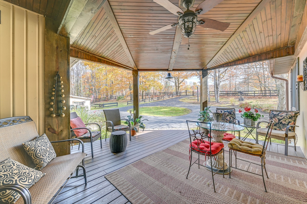 Upscale Country Retreat | Seasonal Pool & Gazebo | 28 Mi to Lake George Relax into refined country living at this Fort Edward vacation rental set on a gorgeous, private farm. Take in woodland views from the expansive deck, unwind by the pool, and enjoy the fully fenced yard — perfect for traveling with dogs. After skiing at West Mountain or shopping and dining in Saratoga Springs, return to stylish interiors and room to spread out. This home offers elevated comfort indoors and out — book now!