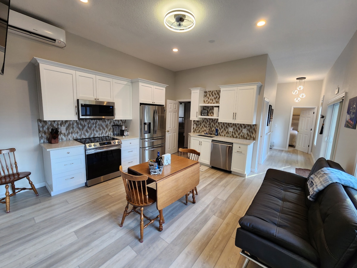 This comfy cottage was designed and built with short-term rental in mind with special features and amenities not typically found in your average listing. Your private entrance welcomes you to a 700 sq. ft. space you can call your own with everything you need for a relaxing stay. The space is ideal for 2 people but can easily sleep up to 4. Heated bathroom floor and gas fireplace provide warmth during the cooler months. Big windows for daylight & views. Backs to a greenspace. Two bathrooms.