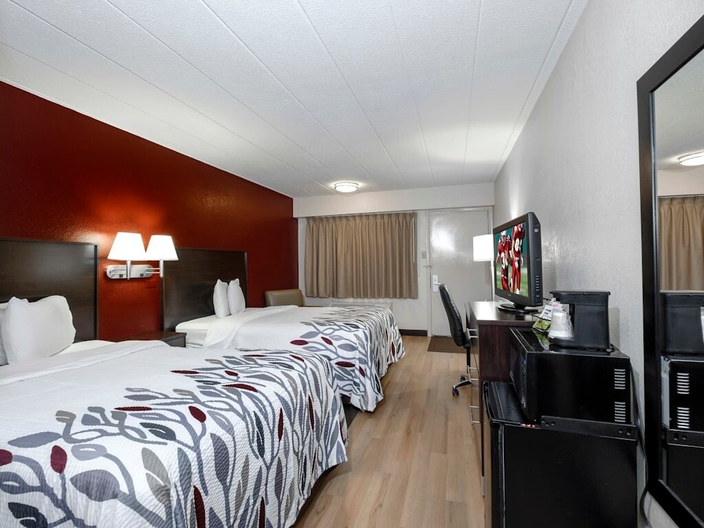 This is a large room with king bed, spacious bath with walk in shower, and private in room hot tub. This room comes with free WiFi and a refrigerator and microwave. We have convenient on site parking and are located right on Rt 51 for an easy trip into Pittsburgh for sporting events, shows and dining out. We have a staffed front desk 24/7 to help with any thing you might need. This room does have a flight of steps from the parking lot to the private entrance.