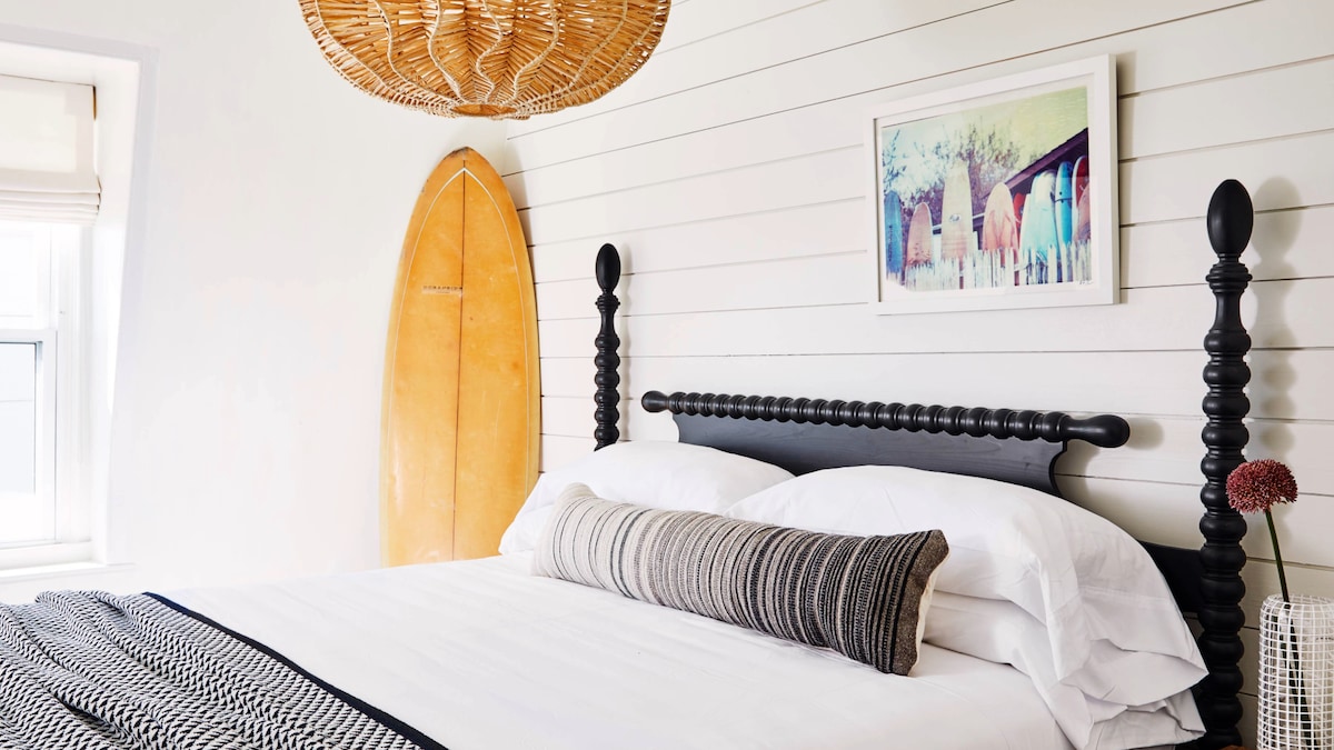 Step into the Vintage King Deluxe at Block Island Beach House—a fun, eclectic tribute to the Surf Hotel’s vibrant past, complete with quirky surf shack décor and charming village views from the 2nd floor. Designed for two guests, this room features a plush king bed, private bath with walk-in shower, and LED flatscreen TV. Added comforts include blackout drapes, a mini-fridge, safe, USB outlets, and free Wi-Fi. Ideal for guests who love unique style and playful character in their coastal retreat.