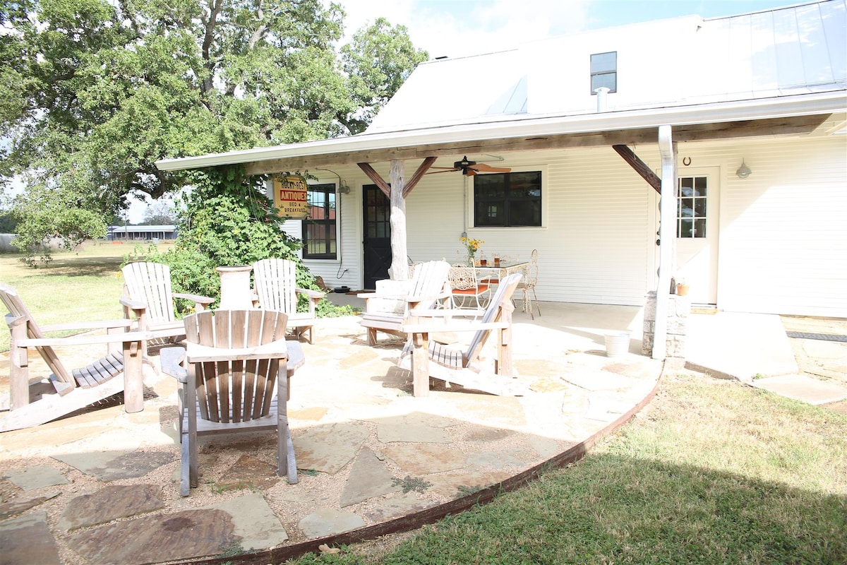 Retreat to Quebe Guesthouse, a restored antique farmhouse surrounded by giant oak trees and walking paths 12 minutes from downtown Brenham. Beautifully furnished with antiques, vintage photographs and Prairie Style collections, this is a time warp with amenities for up to 8 guests. Perfect for girlfriend getaways and wedding parties. You will love walking on the beautiful grounds and sitting on the gallery front porch admiring the view. Fresh breakfast foods provided for self-catering.