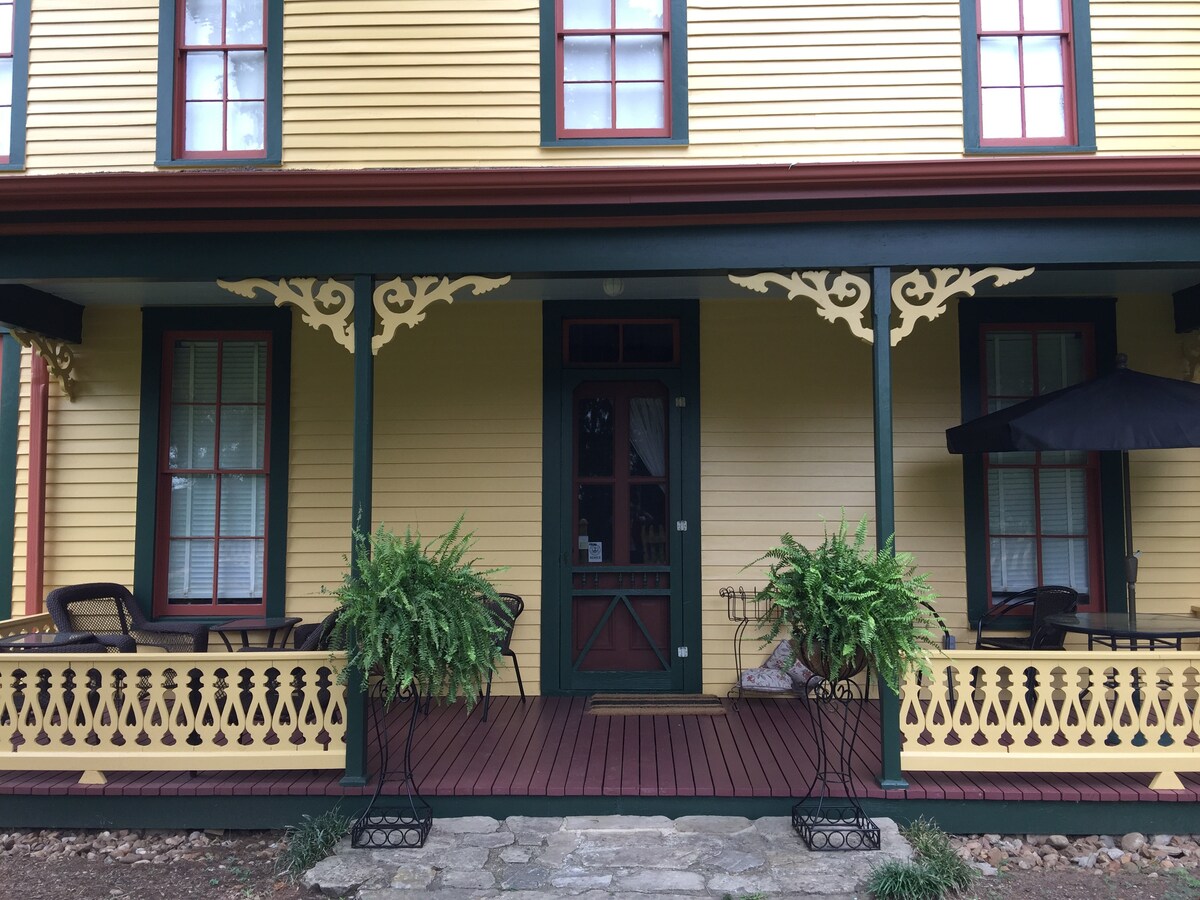 Historic Holle House was built in 1910 and listed on the National Register of Historic Places. This unit is upstairs and has a very large covered balcony with tables, chairs and your own porch swing. It is completely stocked and nicely furnished, including comfy leather Lazyboy recliners. One bedroom has two twin beds, another has a double bed and there is a daybed in the living room. This place has all the comforts of home and sits on a beautiful half acre lot, near downtown.