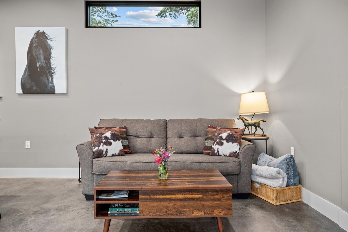Private luxury suite 10 minutes from Round Top, TX. Enjoy a flood of natural light, spectacular views, and some peace & quiet in this eclectic space designed with the comfort of guests in mind. This private suite offers guests a relaxing get-away in the country, far from stress-inducing traffic & smog smothered horizons. Spend your nights cuddled up to a campfire and listen to the coyotes howl as you gaze up at the diamond filled sky. Stay awhile & take-in what it means to live the country life.